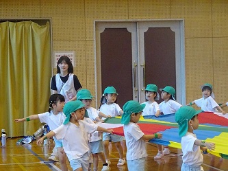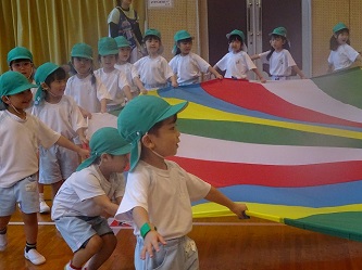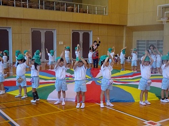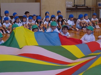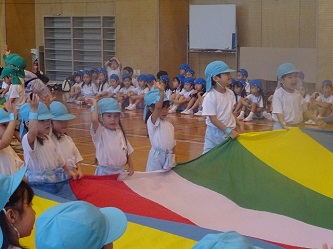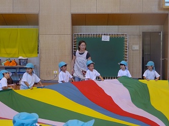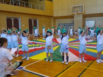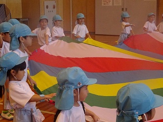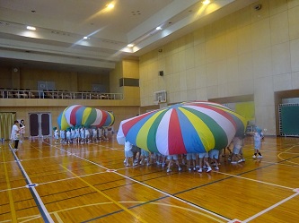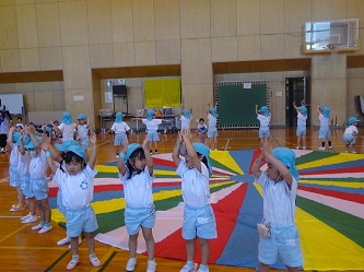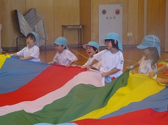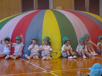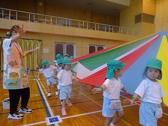 9月16日(火)、年中さんは大学の多目的ホールで、「パラバルーン」の練習をしました。いつもは年長さんが、この場所を借りて練習をしていますが、特別に年中さんも借りて行いました。