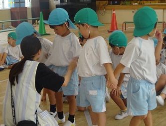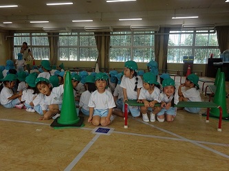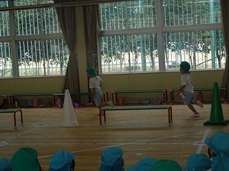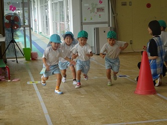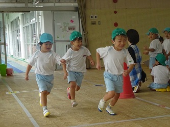 9月24日(水)、年中さんは、遊戯室でかけっこの練習をしていました。