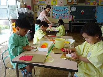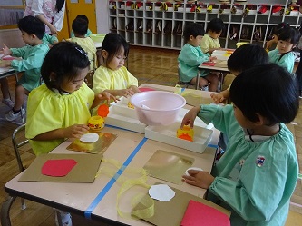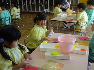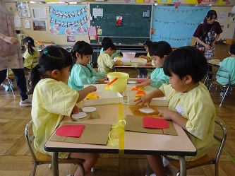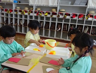 9月30日(火)、年少さんの部屋では、大きな目や舌を袋の貼り付けて、何かを作っていました。