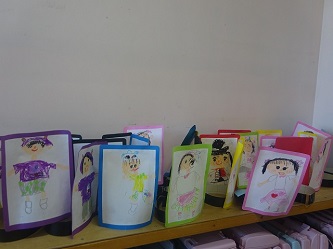 廊下の棚の上には、劇の練習のための被り物が置かれています。