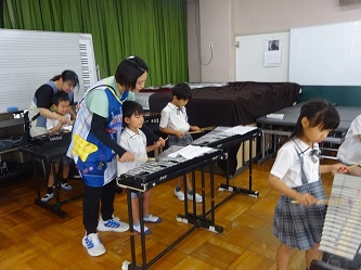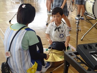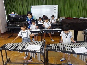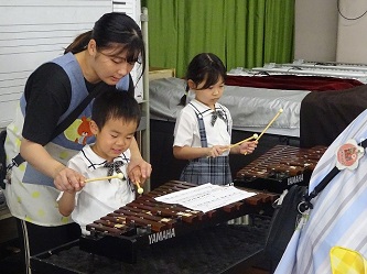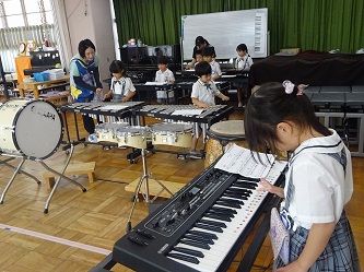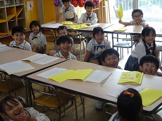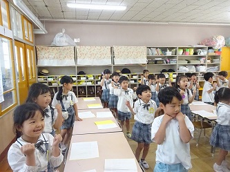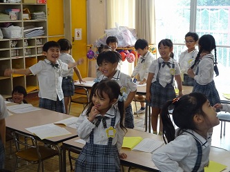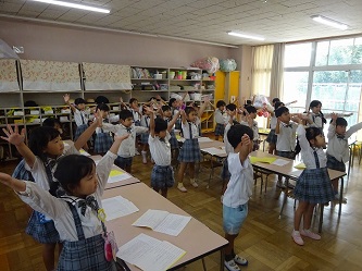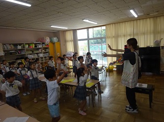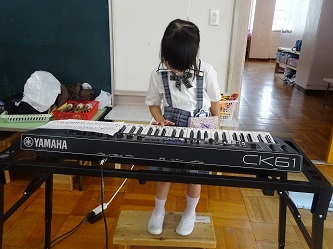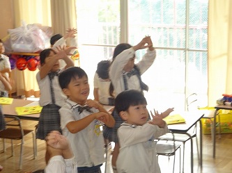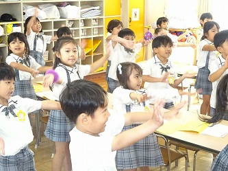 10月10日(金)、年長さんの部屋では、それぞれ「冬の発表会」に向けて、先生と一緒に練習をしていました。