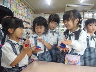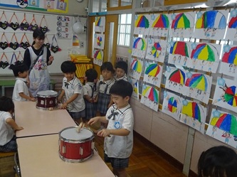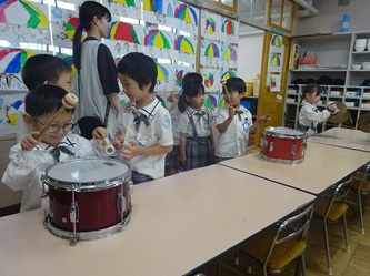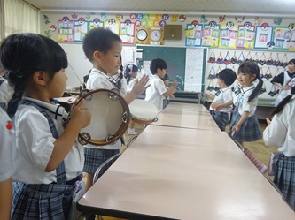 年中さんの部屋では、いろいろな楽器が用意されており、順番に楽器に触れていました。楽しそうに音を鳴らしていました!
