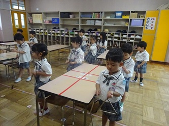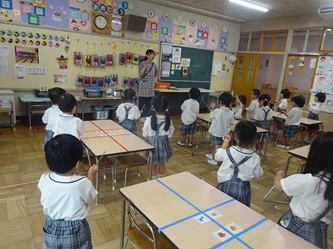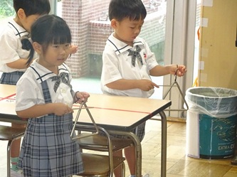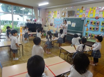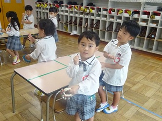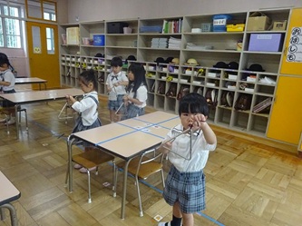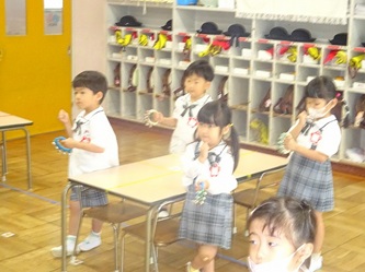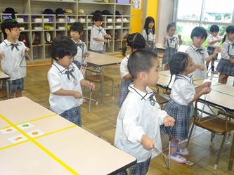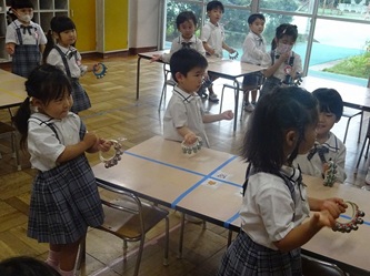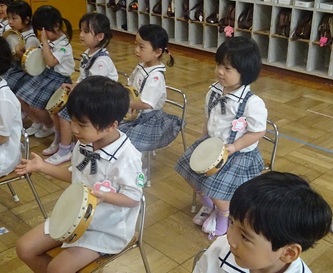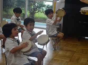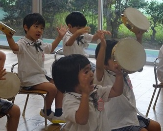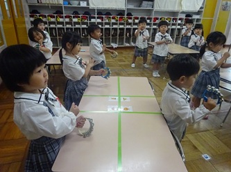 先生と一緒に、リズムに合わせて、楽器を鳴らしていました!