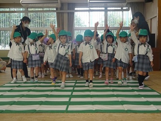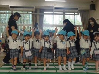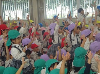 みんなで、信号を見てから、「右、左、右」を見て、手を挙げて横断歩道を渡りました!