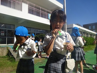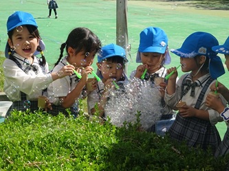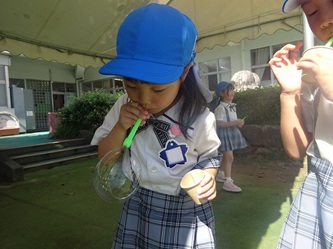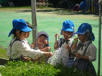 しゃぼん玉を飛ばして遊んだり、おにごっこをしたりして、楽しそうに園庭で遊んでいました!