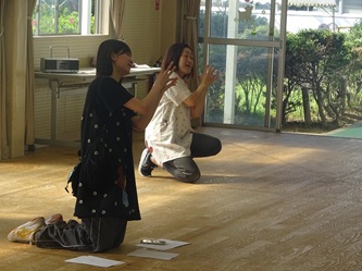 音楽やナレーションは、予め録音されています。それに合わせて演じます。