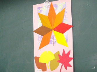 折り紙を折って、きれいな「もみじ」の葉の一部を作っていました。