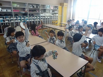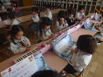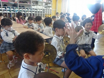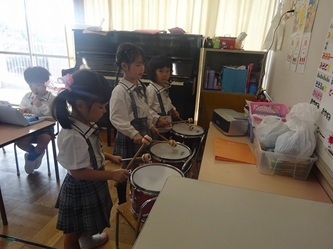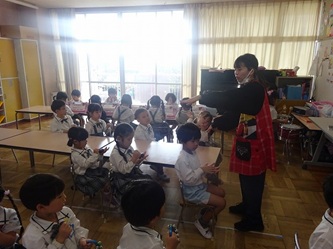 年中さんの部屋では、冬の発表会に向けて、楽器の演奏の練習をしていました。