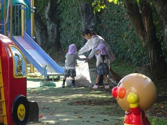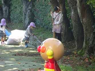 先生が竹ぼうきで落ち葉を集めていると、お手伝いをする年少さんの姿がありました。