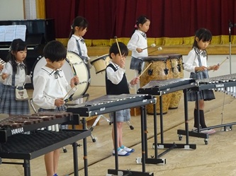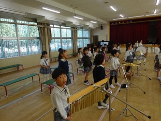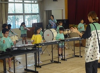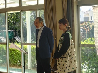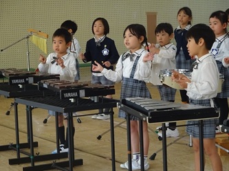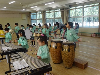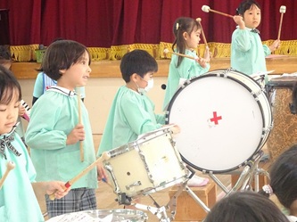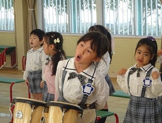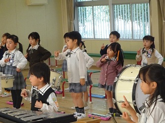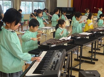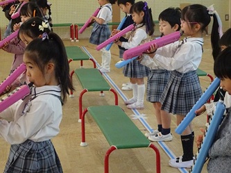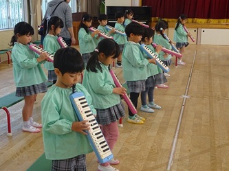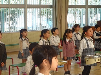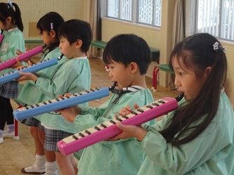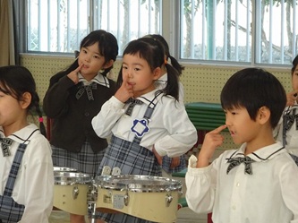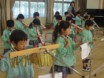 年長さんは、今日も遊戯室で、元オーケストラの指揮者の先生をお招きし、「冬の発表会」に向けて、歌と器楽合奏の練習をしていました。
