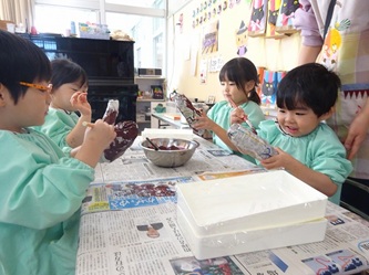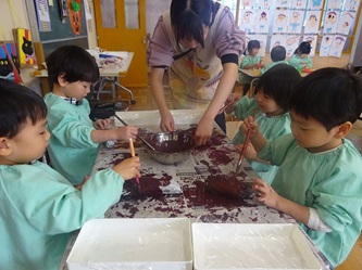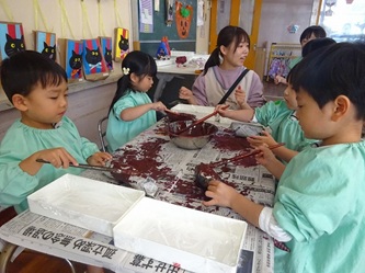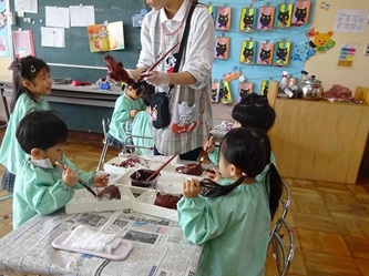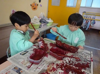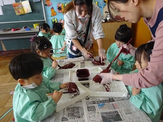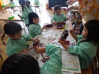 担任の先生たちが、「さつまいも」に見立てて新聞紙で作ったかたまりに、子どもたちは、絵の具を塗って、「さつまいも」を完成させていました!