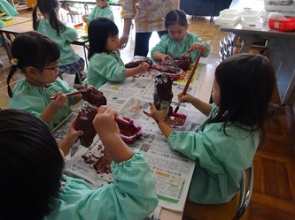 年少さんの部屋では、「さつまいも」を制作あそびを行っていました。