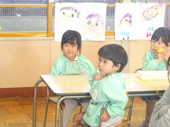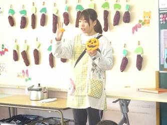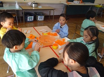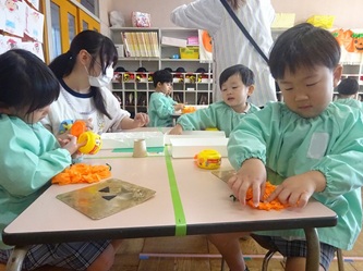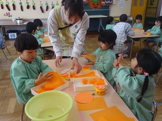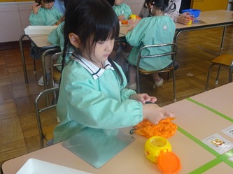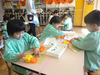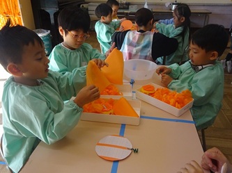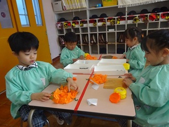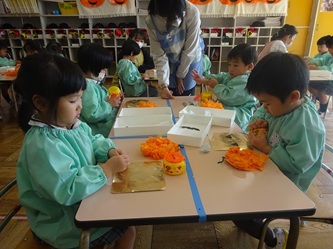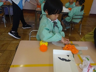 先生の話をよく聞いて、だいだい色の紙を丸めて貼ったり、目や鼻や口をのり付けしたりしていました。みんな一生懸命に取り組んでいました!