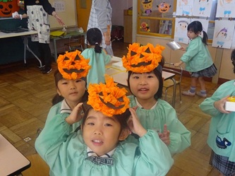 年少さんは、明日の「ハロウィーンごっこ」で使うお面(被り物)を作っていました!