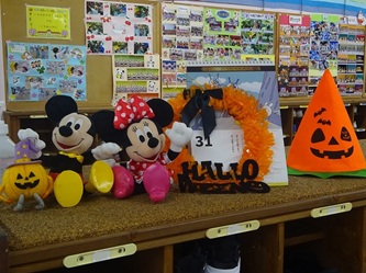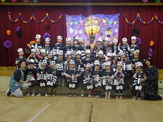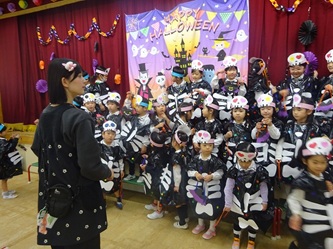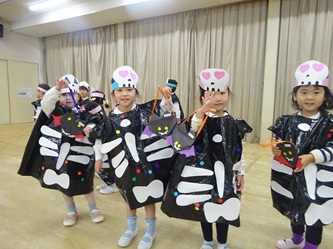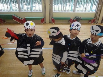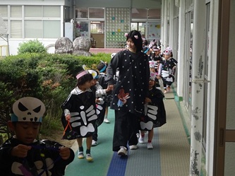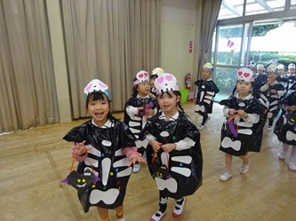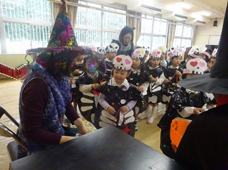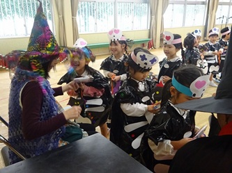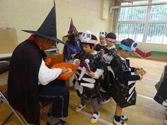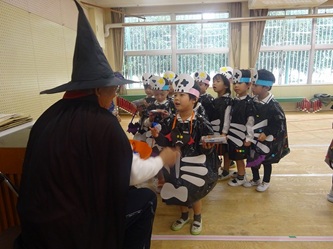 「トリックオアトリート」の合言葉で、お菓子や折り紙をもらいました!