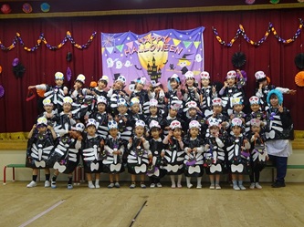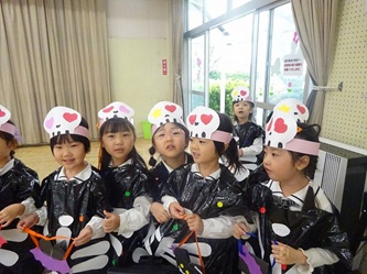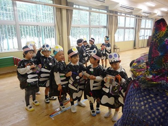 こうもりのバックを持って、遊戯室に学級ごとに集まって、記念写真を撮りました!