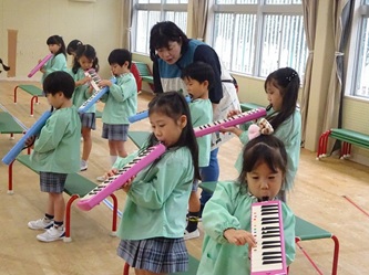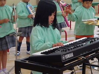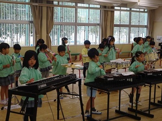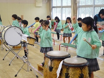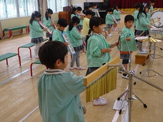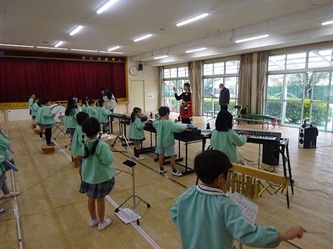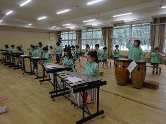 年長さんは、遊戯室で、元オーケストラに指揮者の先生に来ていただき、器楽合奏の練習をしていました。