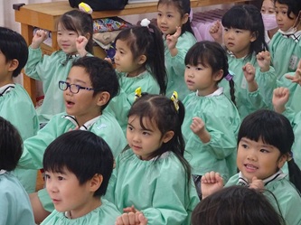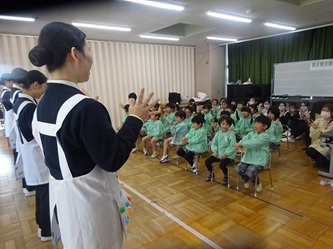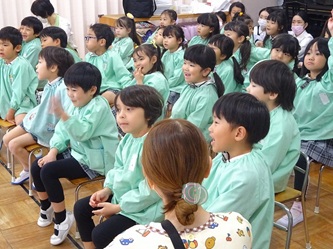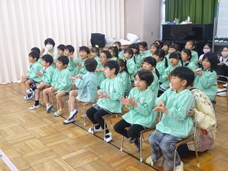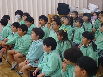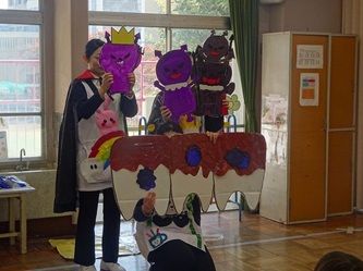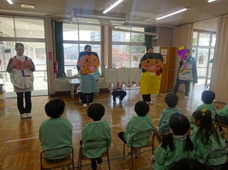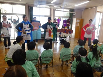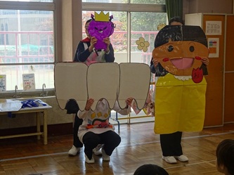 楽しく手遊びをした後、歯磨きの大切さについての寸劇を見せていただきました。