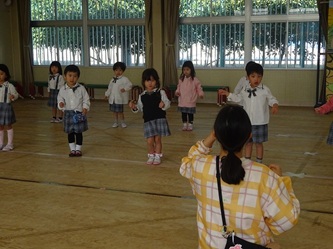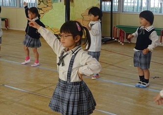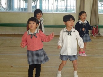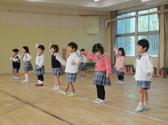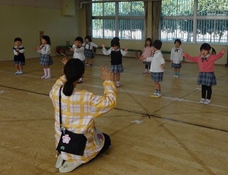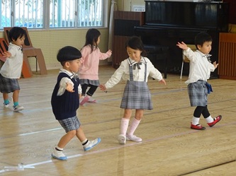 遊戯室で、年少さんが「冬の発表会」に向けて、遊戯の練習をしていました。