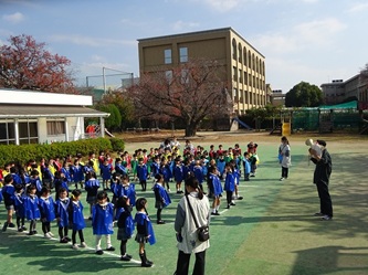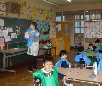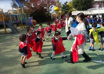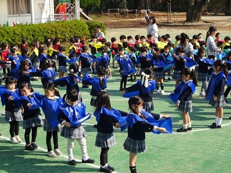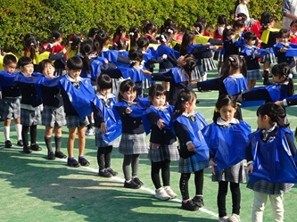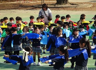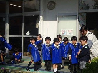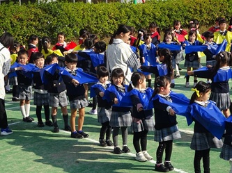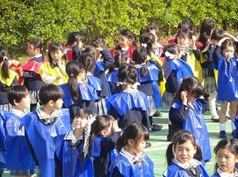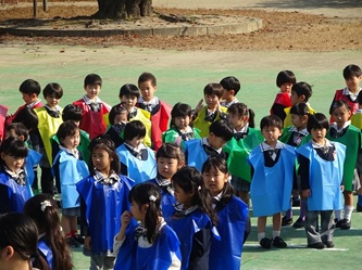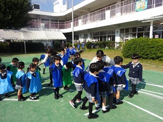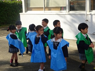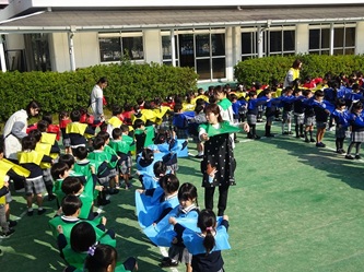 子どもたちは、担任の先生から色のエプロンを配ってもらい、園庭に集合しました!