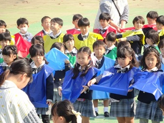 園庭に、予めひかれた白線の上に、分担して立ち、飛行機(セスナ機)が上空にやってきたら、色のエプロンを広げます。