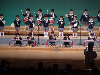 「器楽合奏」では、けん盤ハーモニカに加え、太鼓やシンバルなど、新しい楽器も加わりました。こうやって、年長さんの「器楽合奏」につながっていきます。