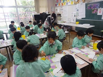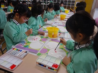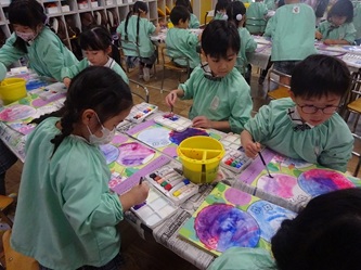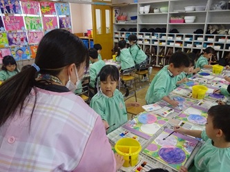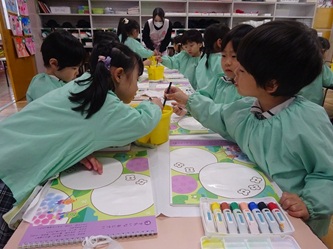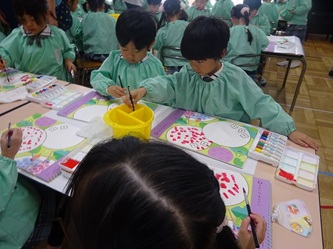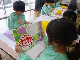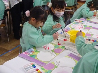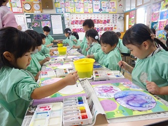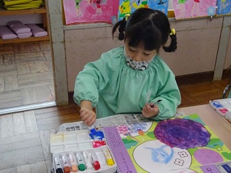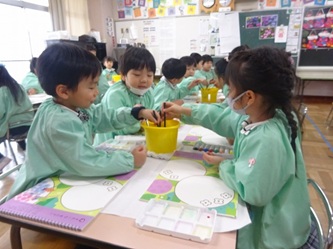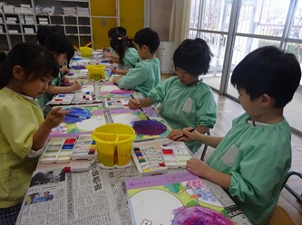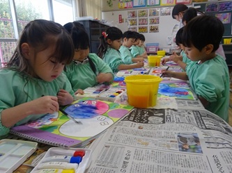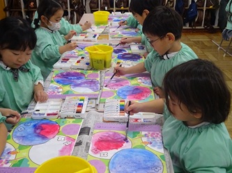 年中さんの部屋では、「絵の具遊び」をしていました。