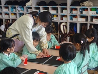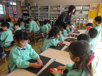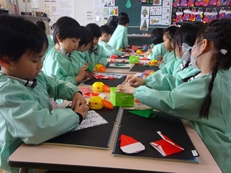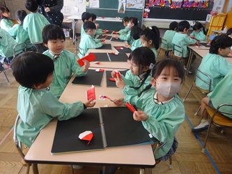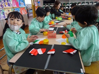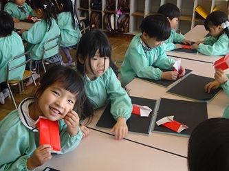 先生から、「サンタクロース」の折り方を教えてもらっていました。