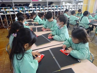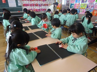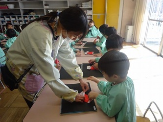 年中さんの部屋では、「サンタクロース」の制作あそびが行われていました。