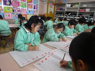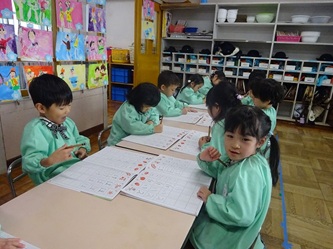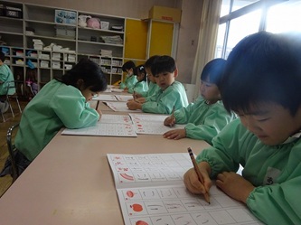 年中さんでは、ワークを使って「ひらがな」を書き始めました。