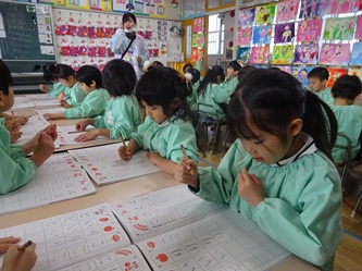 字の特徴をみんなで確認したり、どんな使い方をするのかを発表し合ったりして、字をなぞるところから、始めていました。