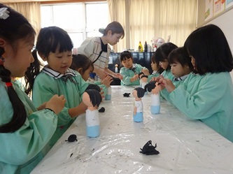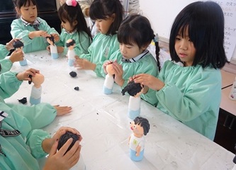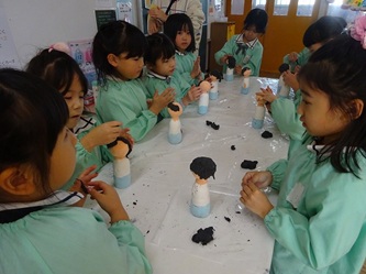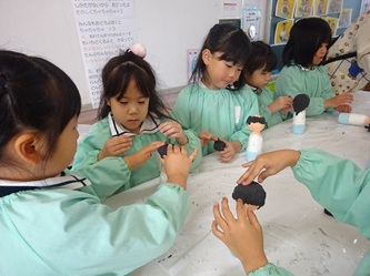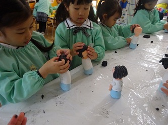 年長さんの部屋では、紙粘土を使って、運動会での自分の姿を表現しているようです。もちろん、上下は体操服です。