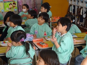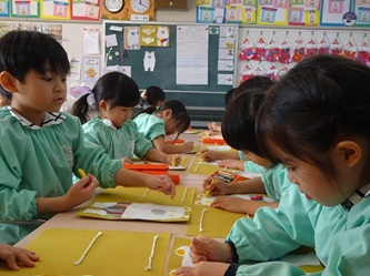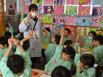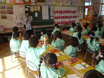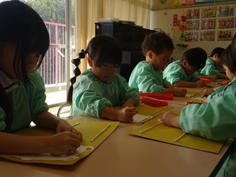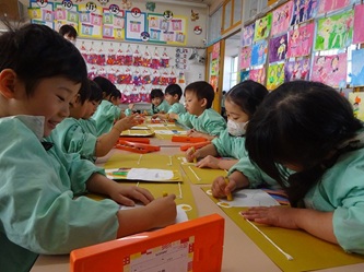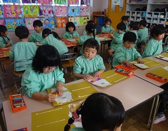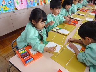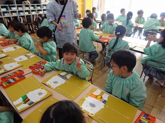 子どもたちは先生の話をよく聞いて、くれよんの色を確認し合ってから、口や目などを順番に、思い思いに描いていました!
