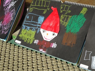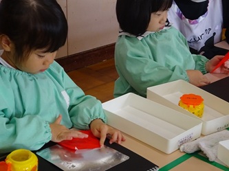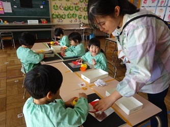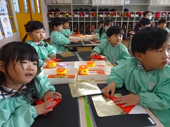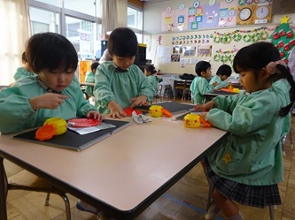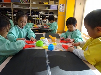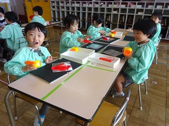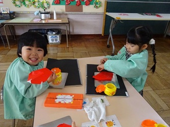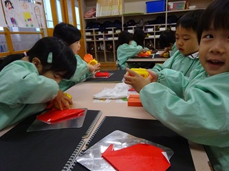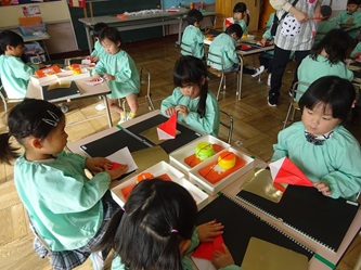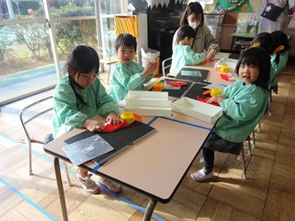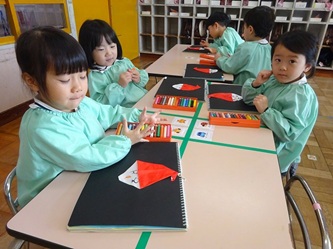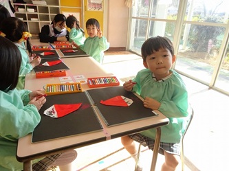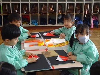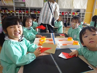 先生から折り紙の折り方を教えてもらい、制作帳へ貼り付けて、くれよんで絵を描く加えていました。