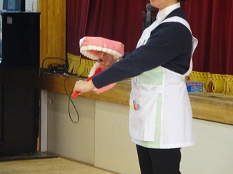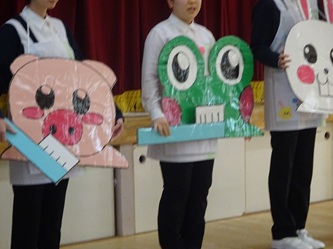 初めに、学生さんから歯や歯みがきの大切さを学ぶ寸劇を見せていただきました。