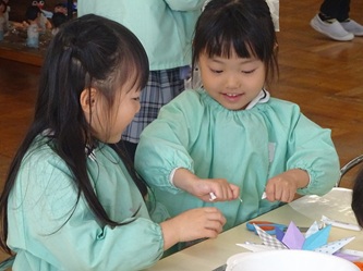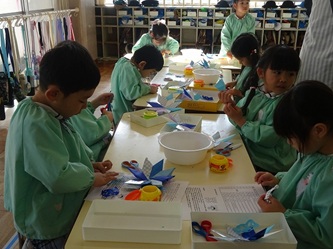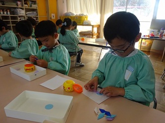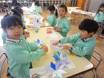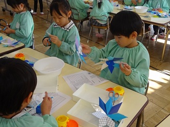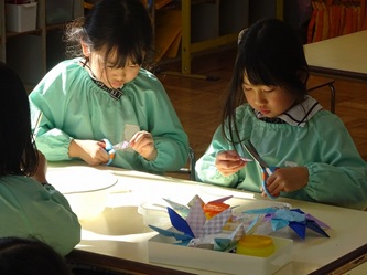年長さんの部屋では、先週に引き続いて、折り紙を使って「雪の結晶」作りが進められています。また、紙の輪っか飾りも作られています。