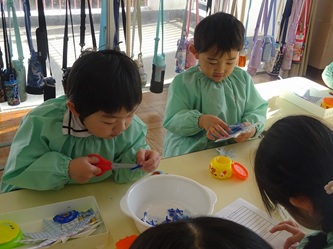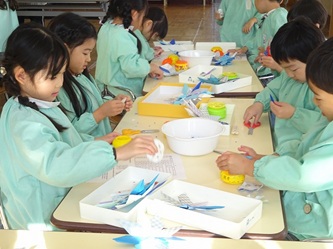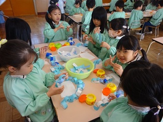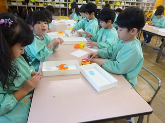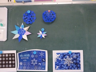 切り絵では、折り曲げられた折り紙を様々な所を切って、素敵な「雪の結晶」に仕上げていました!黙々と取り組んでいました。時々、友だちを見せ合うなどして、楽しんでいました。