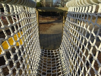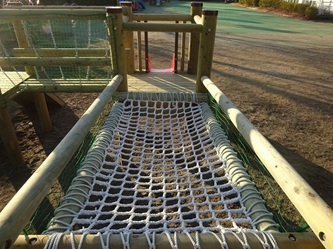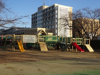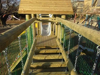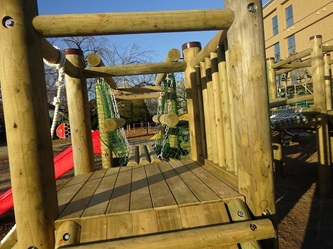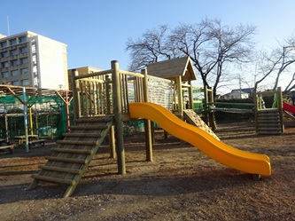 新しい木製遊具は、すべり台も2つになりました。ボルダリングの箇所もあります。木を吊った部分も大きな木になりました。落下防止のネットも初めからついています。大きなひのきが組み合わさってできています。鉄やアルミニウムとは違った、温かみのある感覚を味わうことができます。