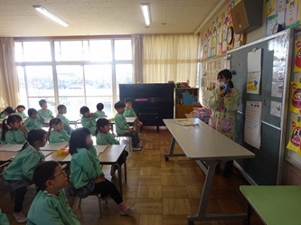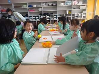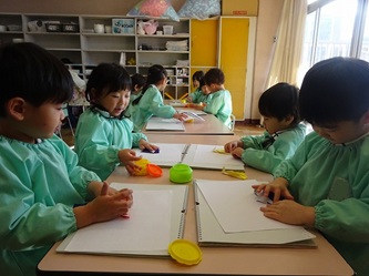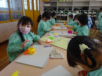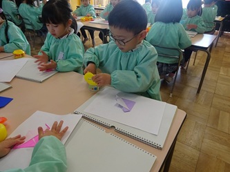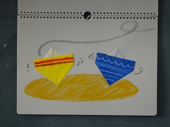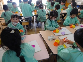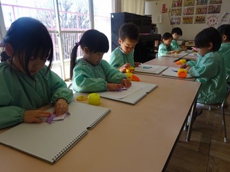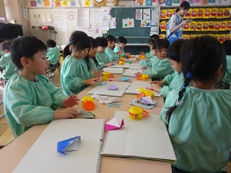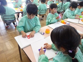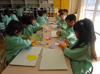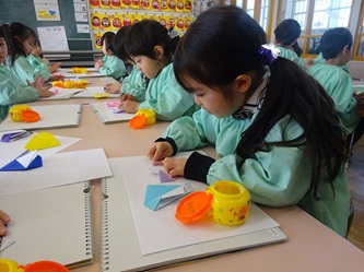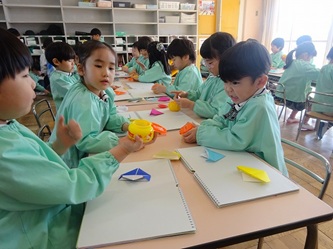 先生の話をよく聞いて「こま」を折り紙で一生懸命に折っていました。