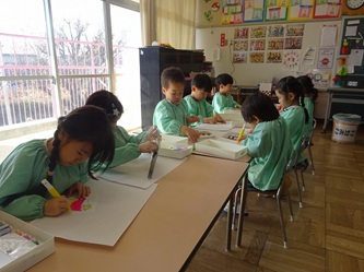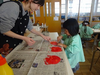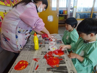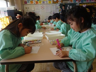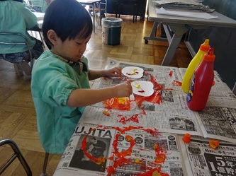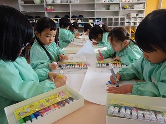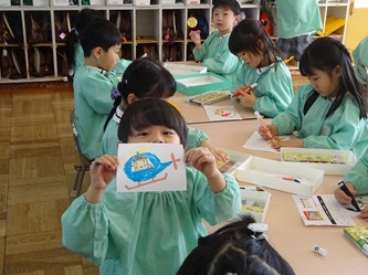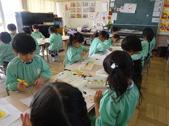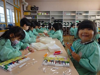 また、前の席では絵の具を使って、先生と一緒に何かを作っていました!