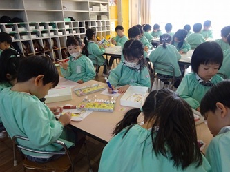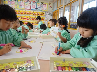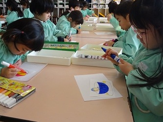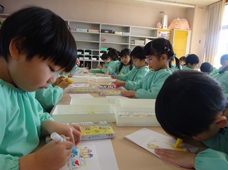 サインペンでいろいろな絵に、思い思いに色付けをしていました。