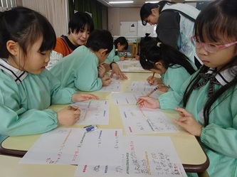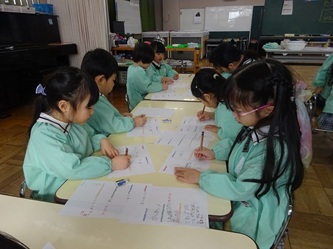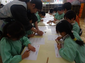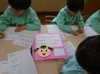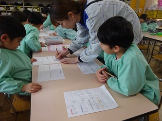 年長さんの部屋では、先生に助けてもらいながら、一人一人が「ひらがな」を使って、プリントに何かを書いていました。
