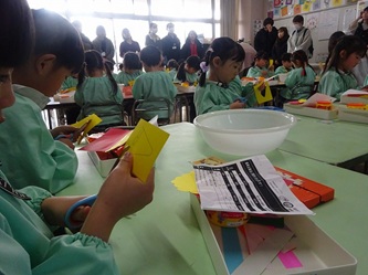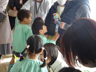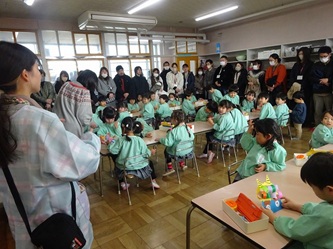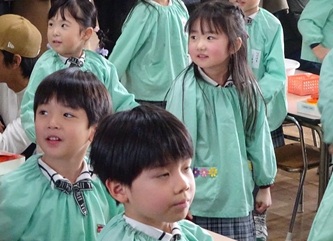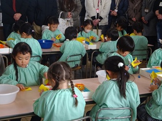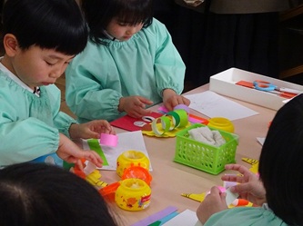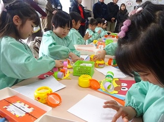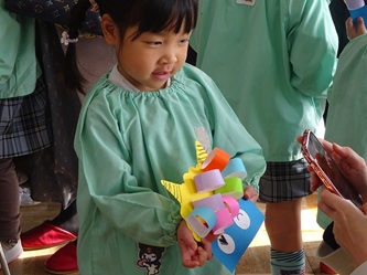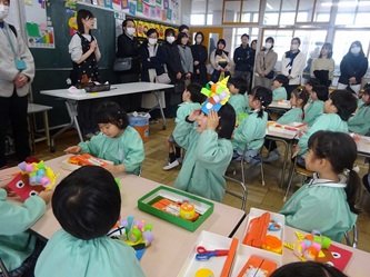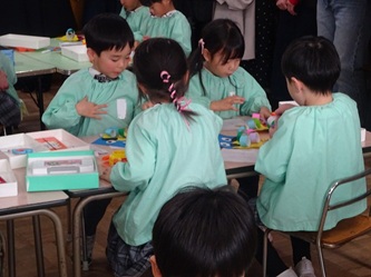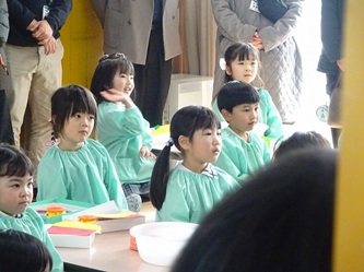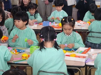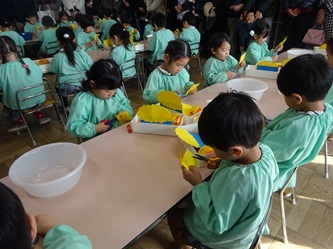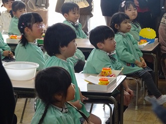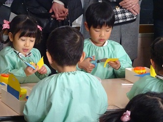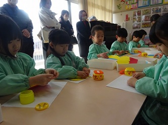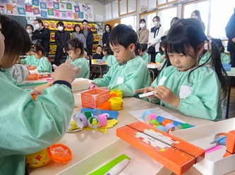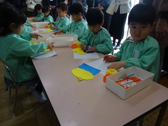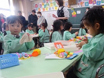 たくさんの保護者の皆様に囲まれ、少し緊張気味でしたが、よく先生の話を聞いて、素敵な「鬼もお面」を作ることができたと思います。