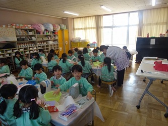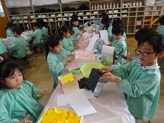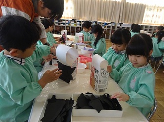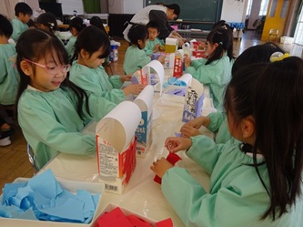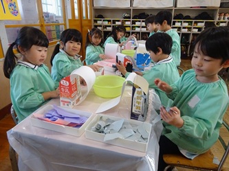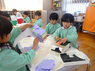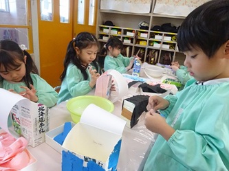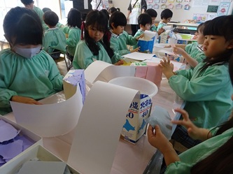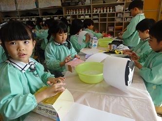 年長さんの部屋では、牛乳パックをあわせた物から、何かを黙々と作っていました。