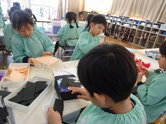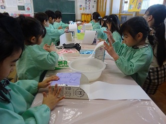 どうやら、「ランドセル」のようです。思い思いの色紙を貼り付けて、素敵な「ランドセル」を作っていました!