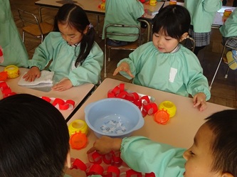 子どもたちは、一生懸命に色紙をのり付けして、輪を組み合わせて飾りを作っていました。