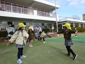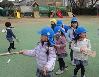 午後、園庭の雪が融けて、年長さんは羽根つきに挑戦していました!