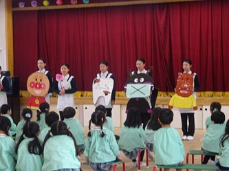 本日、歯科衛生専門学校の先生と学生さんがやってきて、年長さんを対象に「歯磨き教室」がありました。