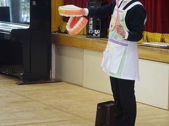 寸劇を通して歯磨きの大切さや、歯ブラシと口の模型を使って歯磨きの方法について、教えてもらいました。