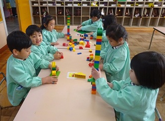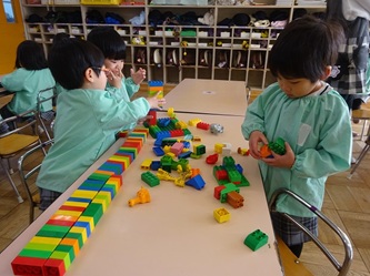 ブロックで建物や車や電車など、思い思いに作っていました。
